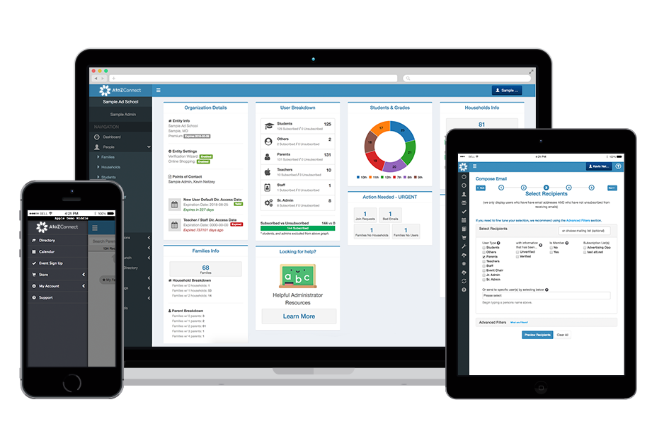 School communities use AtoZ Connect to efficiently communicate, share information and stay connected. Find out how schools are saving time and money. Everything is available at their fingertips. Driving direction to their child’s friends house or the email address for their teacher or room parent. Easily add the school and lunch calendar so parents are always in the know. Parents can add themselves to the database and verify their information so it’s always up-to-date. No more trying to read illegible paper forms. Your parents are already in our software verifying their data for the directory. Why not give them the chance to join your parent group and make a donation at the same time. Credit card payments also result in fewer lost checks and easier end of year reconciliation. Using cutting edge technologies to ensure we maintain the highest level of availability and security possible.