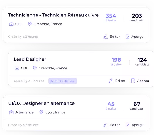 Features designed to optimize your recruitment processes. Management and multi-dissemination of job offers. Unlimited creation of job offers according to your recruitment needs. One-click sharing of your job offers on social networks. Assignment of status to each job offer (draft, online, etc.) Free multi-posting to multiple job sites in 1 click. Optimization of the referencing of your company and your job offers. Centralization, management, and sorting of applications. Movement of the candidate from one stage to another. Instant visualization of all key candidate details (contact details, comments, etc.) What are you waiting for to simplify your recruitment? Manual addition of a candidate. New application email alert. Contact by email with a candidate. Addition of comments on a candidate file. Adaptation to mobile browsing. Centralization of all your job offers. Recommendation of employment sites adapted according to the profiles sought.