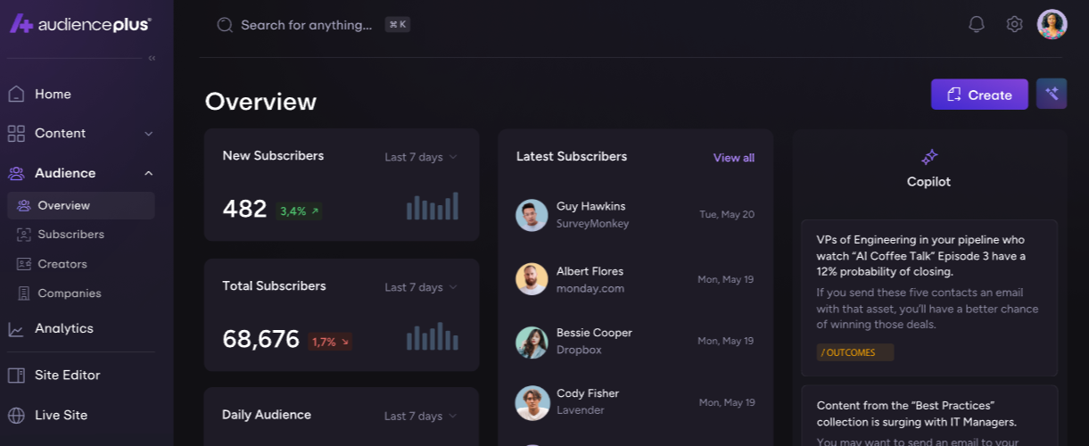 Build tomorrow’s pipeline today with AudiencePlus by becoming your own channel for content distribution and leveraging AI and first-party data to understand your audience like never before. Your competitors are all executing the same old transactional playbook to build a pipeline, creating more noise than ever for buyers. To rise above, you need to build and develop meaningful relationships at scale. Convert website traffic and social followers into loyal subscribers, giving you direct access to your audience with no algorithm in the way. Launch a modern media property as an extension of your website to showcase your best content, no dev support needed. Leverage AI workflows informed by your first-party data to gain deep insights into your audience and their interests. Unlock powerful intent signals to inform marketing decisions, identify ready-to-buy customers, and connect them to sales with the context they need to close.