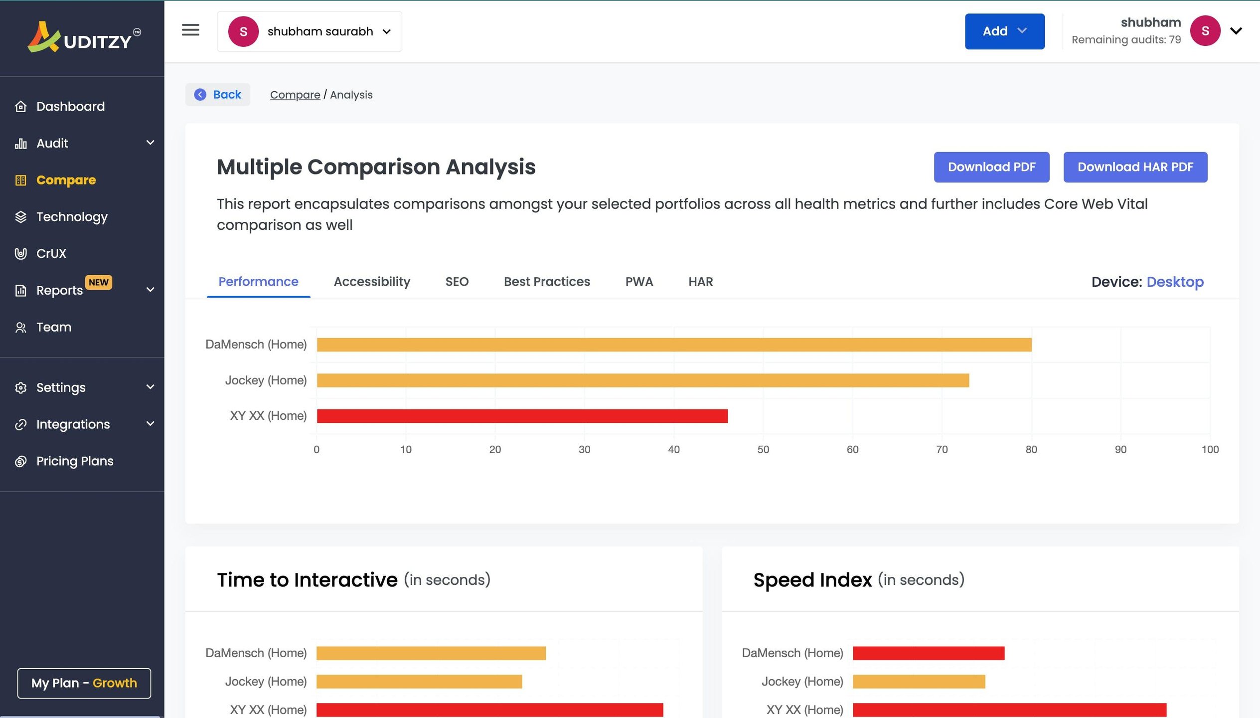 Auditzy brings you reports in a few clicks, while most page speed tools require detailed setup and supervision. With Auditzy, businesses understand their web page performance, accessibility, and Technical SEO insights across multiple technical parameters to enhance visitor interactivity experience for websites. These checks highlight opportunities to improve the performance of your web app. Auditzy offers a free web page speed test through a simple and user-friendly graphical interface to provide a quality performance report. With Auditzy, gain insights and suggestions about your performance metrics and how to improve them in business terms. Auditzy insights are not just limited to your website. You can also deep dive into competitive analysis and compete in a smarter way with your competitors. Auditzy™ provides comparative analysis across multiple portfolios to understand and overcome your shortcomings.