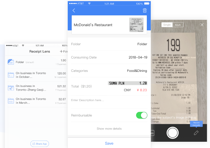Just snap a picture of a receipt and turn it into digital data on-the-go. Add your expenses manually in the absence of receipts. Customize consumption categories and customize the names of your folders. Categorize, tag, and group your receipts and invoices into different folders for easy management and reimbursement. Organize your receipts into different folders. Select receipts to generate your professional expense report, and export the report and receipt images to your mail and QuickBooks. Reimburse with your expense report and see your incomes and expenses at a glance. Share your folders with friends, family, roommates or coworkers to track co-expenses. No need to identify the same receipt on multiple devices. Batch processing, import images of your receipts and get recognition results in seconds. Auto-sync with Receipt Lens Mobile, changes made in the app will show on the web, and vice versa.