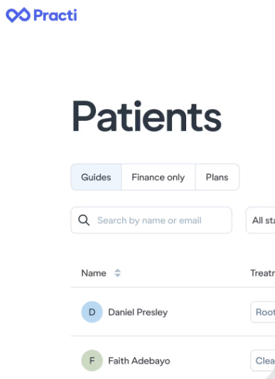 Practi is a digital platform designed to help dental practices modernize the patient payment experience while reducing administrative work and improving treatment acceptance. It provides a branded patient portal where clinics can share treatment information, payment options, and follow-up communication in a single online hub. Through it, dental teams can send patients personalized treatment details, notes, attachments, and cost estimates so they have all the information needed to decide whether to proceed with treatment. It also integrates financing options directly into the patient journey, allowing practices to present loan terms, online applications, and real-time credit decisions alongside treatment plans. It helps streamline clinic workflows by consolidating finance, payment plans, and other administrative processes under a single login, enabling staff to track patient activity, manage follow-ups, and monitor the status of applications.