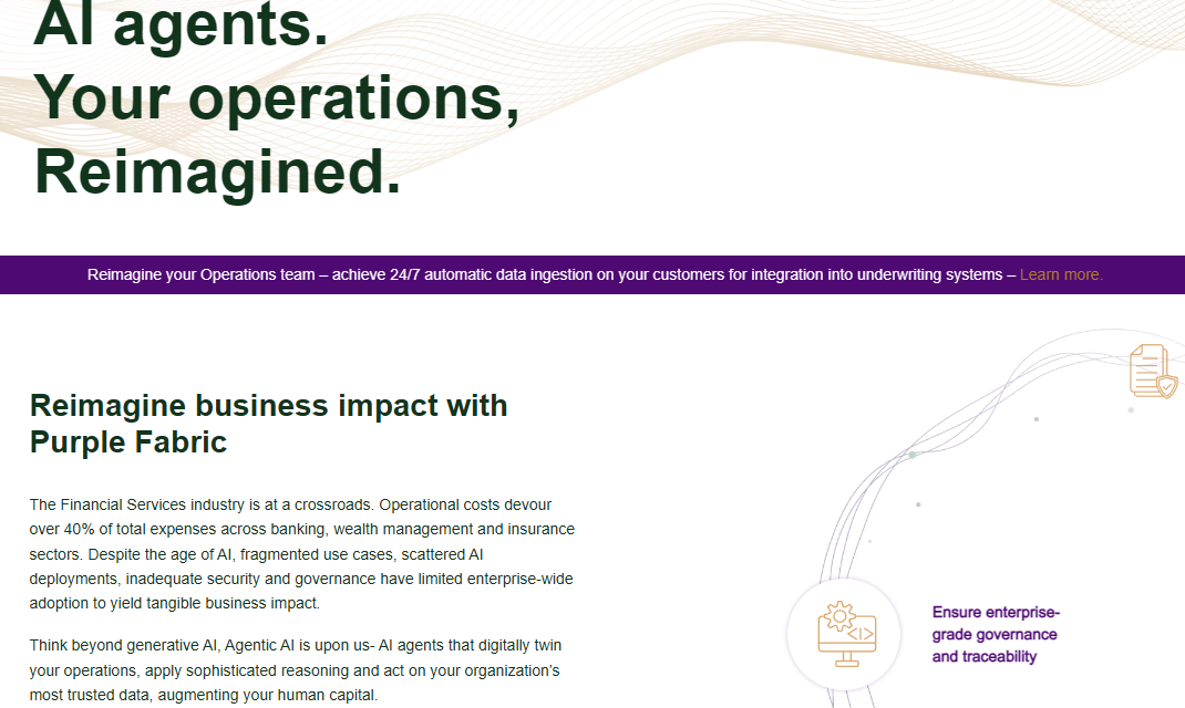 Purple Fabric is an advanced enterprise AI platform developed by IntellectAI, designed to enable financial institutions to swiftly create, deploy, and manage AI-driven solutions through a low-code, self-service approach. Leveraging the eMACH.ai framework, Purple Fabric integrates structured and unstructured data, regulatory information, market insights, and tacit knowledge into a unified system, facilitating the development of AI agents that enhance decision-making and operational efficiency. It emphasizes ethical AI by providing comprehensive governance, audit trails, and data lineage, ensuring transparency and compliance. Its modular architecture includes components like PF Imagine for AI solution design, PF Govern for governance and compliance, PF DIMS for document intelligence, PF Expert Agent for autonomous decision-making, and PF Triad for unbiased decision support. Purple Fabric's capabilities have been successfully applied in various financial services scenarios.