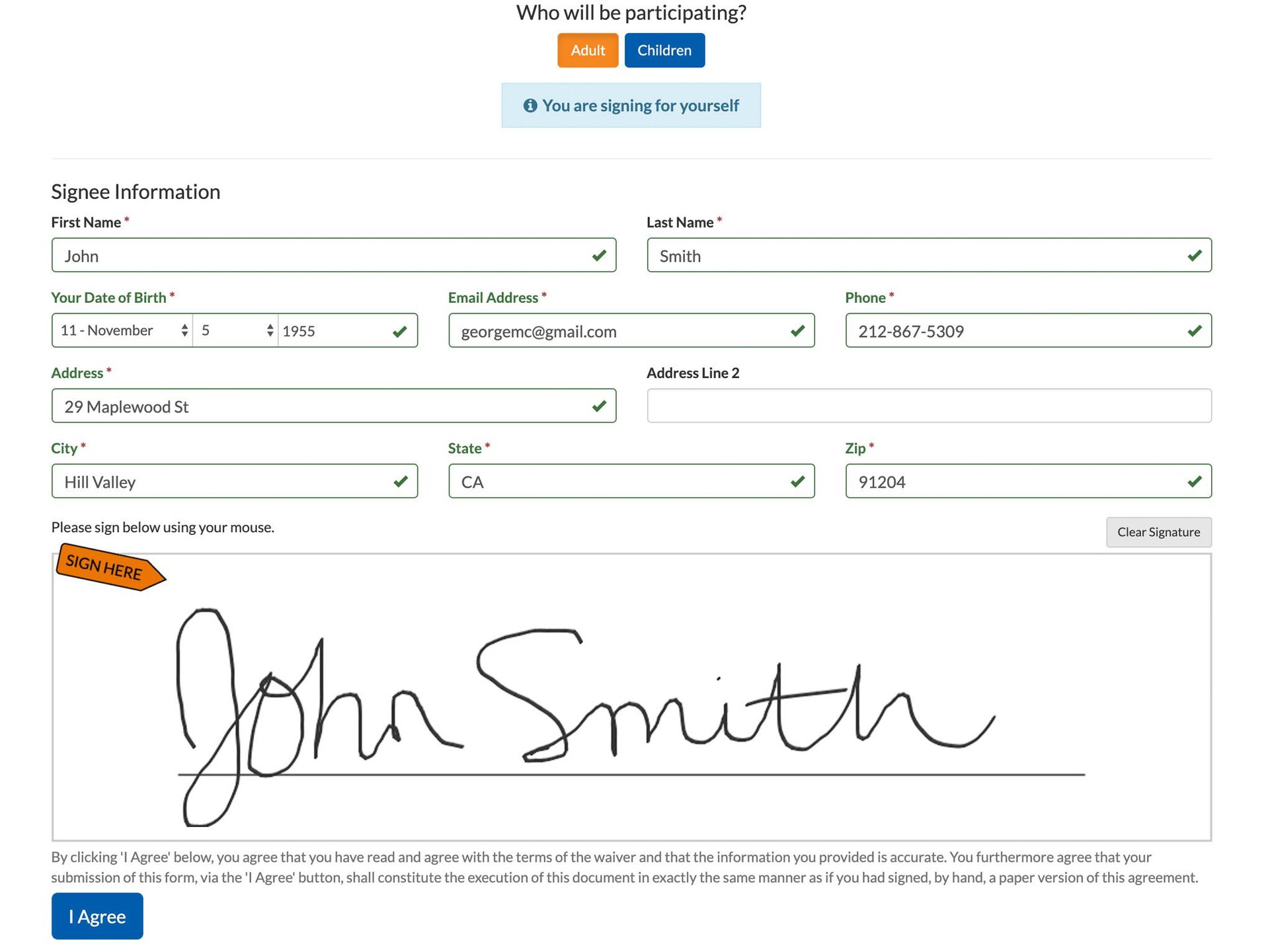 WaiverFile is the industry leader in online waiver form software. Our focus on building beautiful, well-designed features means that our system is easier to use for both you and your customers. This means you can take advantage of all the benefits of electronically signed waivers without frustrating your customers and staff. Signing on any device from anywhere means customers can sign in advance and check in faster! Our check-in tracking and event features make verifying signed waivers far easier than searching through one huge list of everyone. WaiverFile doesn't just store forms, it helps streamline your entire customer intake process. Use the WaiverFile app to setup a kiosk for on-site signing, and print and display QR codes so customers can sign on their own smartphone. The WaiverScan app speeds checkins by providing signees with a QR code upon completing a waiver that can be scanned with the app for quick verification.