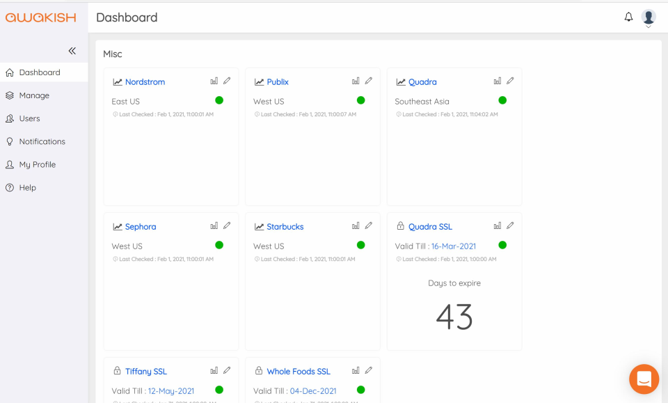 Awakish is a website monitoring tool that helps businesses instantly detect downtime, monitor SSL certificates, generate performance reports, and more. Suitable for both customers and vendors like MSPs and SIs. The best monitoring solution is the one that gets deployed and used! Skilled IT experts are not required, but if you are a skilled tech professional, you’ll appreciate the time-saving simplicity of our 2-minute installation or our free batch upload service for large pools of HTTP endpoints and servers. We provide a secure and easy to monitor solution for all the assets that you watch over - regardless of location, cloud, or technology. Anything you can ping, we can monitor. Awakish can also allow your customers to see how well you are servicing them. With constant uptime status, shared summary reports and status badges that you can embed anywhere, you can stay top of mind with your clients.