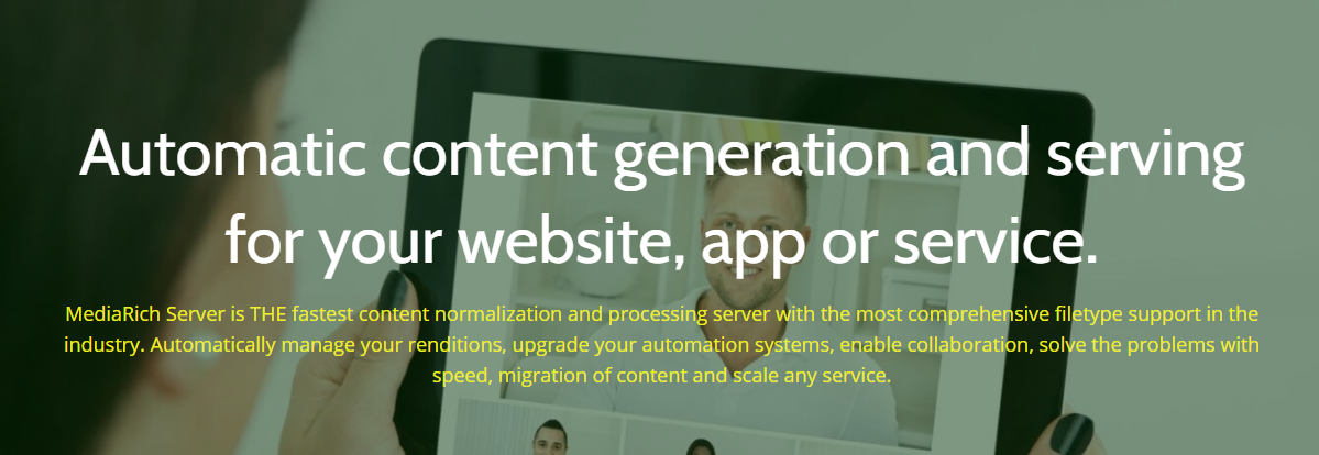Automatic content generation and serving for your website, app or service. MediaRich Server is THE fastest content normalization and processing server with the most comprehensive filetype support in the industry. Automatically manage your renditions, upgrade your automation systems, enable collaboration, solve the problems with speed, migration of content and scale any service. Most Organization's Asset Management Workflows are bloated. Does your company still process assets manually? Ever have difficulty finding and viewing media assets? A bloated asset creation and delivery workflow leads to inconsistent company branding, slow merchandizing, and lagging promotional programs. MediaRich Server automates content processing and delivery, drastically decreasing the time and labor it takes companies to publish perfectly formatted content to websites, B2B portals, internal tools and more. Deploy on-premises, in your datacenter of choice or in the cloud.