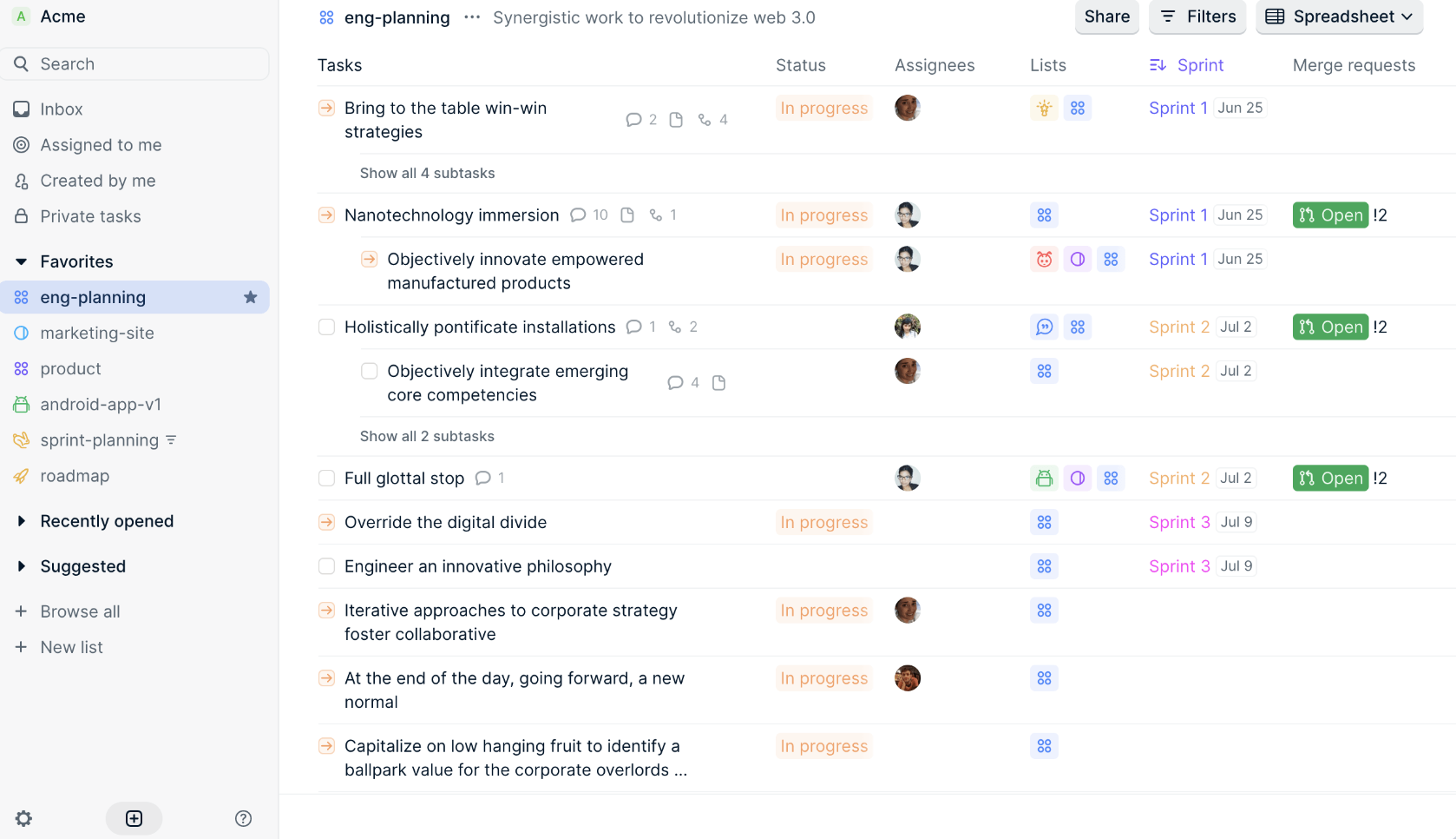 Real-time tasks, chat, and powerful customization to get everyone on the same page. Keep tasks up-to-date, automatically by linking tasks to commits, branches, and pull requests. Track and prioritize bugs to make sure they get fixed fast. Organize work into sprints, milestones, releases, etc to keep teams on the same page. Connect & coordinate cross-org to launch new products without a hitch. Collaborate with engineering and design to organize product launches. Communicate progress and build momentum each step of the way. Keep other key stakeholders involved and in the loop with real-time chat. Track requests from other teams in one centralized place to triage and plan around. Plan and work on sensitive tasks with only the people who need to be involved. Invite clients to collaborate with you, stay updated on progress, and chat about projects.