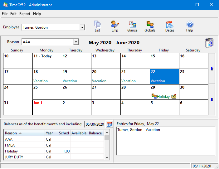 TimeOff records the hours that employees were not at work by different categories. It automatically calculates the benefit hours each employee earns, and updates balances as the information is entered. All of which are set according to your own policies and preferences. Time off entries can be reported by employee or by department. And you can use the Month Calendar report to see who is scheduled for which kind of leave for the month.