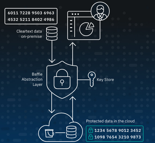 Baffle provides universal data protection from any source to any destination to control who can see what data. Enterprises continue to battle cybersecurity threats such as ransomware, as well as breaches and losses of their data assets in public and private clouds. New data management restrictions and considerations on how it must be protected have changed how data is stored, retrieved, and analyzed. Baffle’s aim is to render data breaches and data losses irrelevant by assuming that breaches will happen. We provide a last line of defense by ensuring that unprotected data is never available to an attacker. Our data protection solutions protect data as soon as it is produced and keep it protected even while it is being processed. Baffle's transparent data security mesh for both on-premises and cloud data offers several data protection modes. Protect data on-the-fly as it moves from a source data store to a cloud database or object storage, ensuring safe consumption of sensitive data.