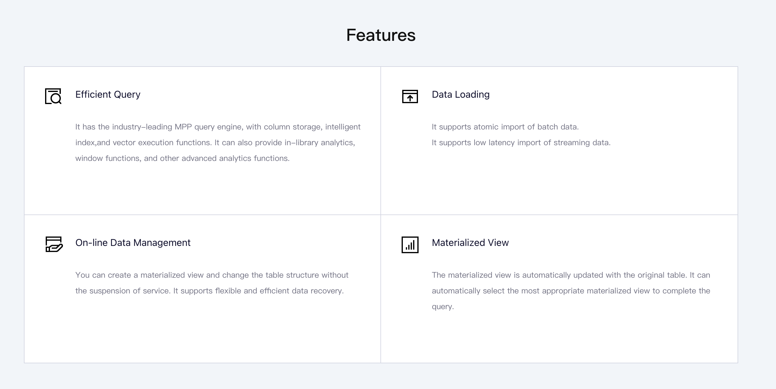 Palo helps enterprises to create the PB-level MPP architecture data warehouse service within several minutes and import the massive data from RDS, BOS, and BMR. Thus, Palo can perform the multi-dimensional analytics of big data. Palo is compatible with mainstream BI tools. Data analysts can analyze and display the data visually and gain insights quickly to assist decision-making. It has the industry-leading MPP query engine, with column storage, intelligent index,and vector execution functions. It can also provide in-library analytics, window functions, and other advanced analytics functions. You can create a materialized view and change the table structure without the suspension of service. It supports flexible and efficient data recovery.