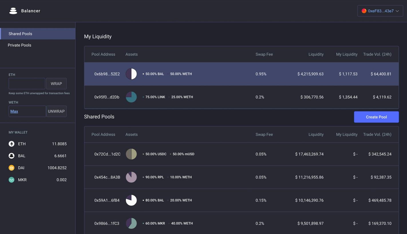 Balancer protocol is a non-custodial portfolio manager, liquidity provider, and price sensor. Customizable number of assets and weights within a pool. Trade against all pools in the Balancer ecosystem for best price execution. Pools controlled by smart contracts can implement any arbitrary trading strategy or logic. Exchange tokens without deposits, bids / asks, and order management. All on-chain. Preview an expected trade price for two assets given existing liquidity and slippage. Trades are split through an SOR which performs an optimization across all pools for best price execution. Frontends are open-source and will be made available through IPFS. Trade any tokens without need for whitelisting or approval. A Balancer Pool is an automated market maker with certain key properties that cause it to function as a self-balancing weighted portfolio and price sensor. Up to 8 tokens. Any weights. And programmability through smart-contract owned pools.