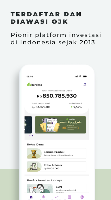 Investments in mutual funds and state securities (SBN) are easy and convenient. Registration without physical documents in a matter of minutes you can invest in mutual funds and SBN. Bareksa the first investment application that has an APERD license from OJK. Free to choose the best sharia and conventional mutual fund investment products in Indonesia. Simulate the product of your choice or choose from the Top Product page which is regularly evaluated by Bareksa. Contributions to state aid are 100% safe. Returns are sent directly to your account every month. Mutual fund investment at Bareksa is free, can be added and withdrawn at any time, without a period of time, without penalty fees.