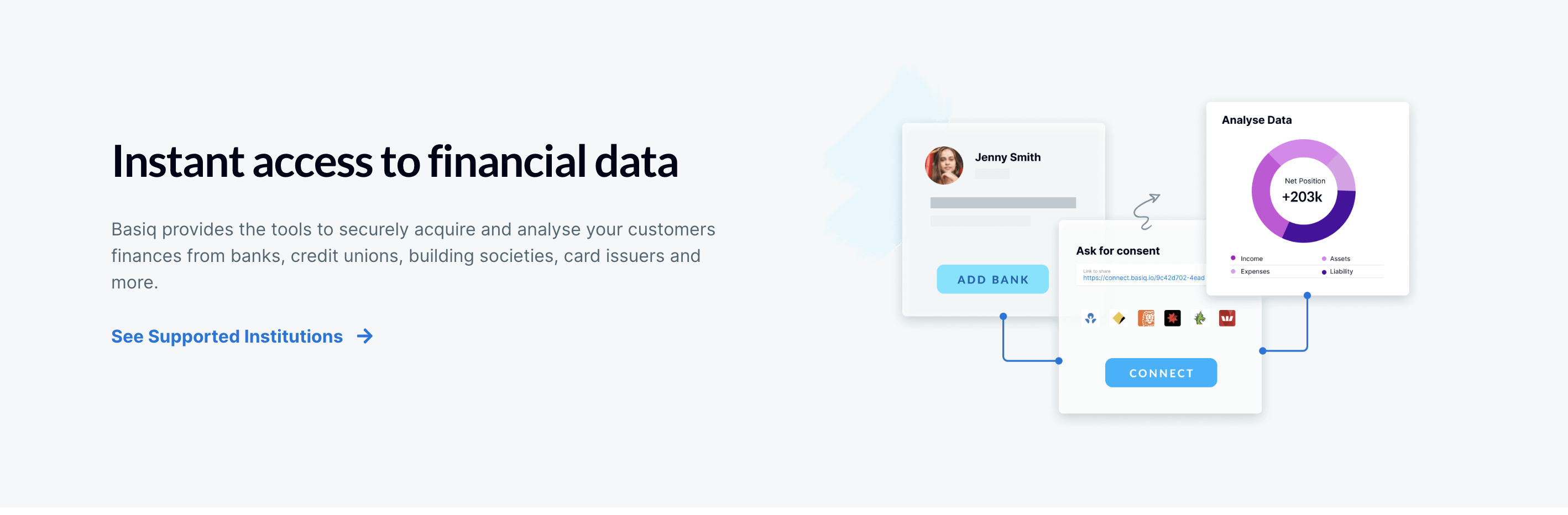 Basiq is the leading open banking platform enabling developers to build innovative financial solutions. We provide secure access to customer-consented financial data and powerful APIs that uncover valuable insights. We're powering the future of financial apps and services with solutions for wealth managers, banks, fintechs, and more. Get access to complete and reliable banking data to deliver more engaging, personalised digital banking experiences. Use our advanced income algorithms to reliably identify all sources of income such as regular, variable and casual income streams. Enabling you to streamline individual assessments and make faster lending decisions. Provide your customers with a rich digital experience by helping them better understand where they’re spending. Use Basiq Enrich to identify the merchant, location and category of each bank transaction.