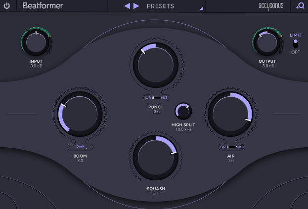 Effortlessly shape the sound of your beats with 4 intuitive controls, Boom, Punch, Squash and Air. Blend analog-style processing with modern digital technology. Transparently fine tune or fully transform your beats with the turn of a simple dial. With over a dozen different processors under the hood, Beatformer allows you to breathe new life into your beats. Glue your drum mix together, bring energy into overprocessed loops, easily enhance your beat’s dynamics, add colour and personal character to your beats. Add substance to thin sounds, and instantly transform the sound of your beats. Behind the simple and intuitive user interface of Beatformer is a complex signal flow which is described in the diagram. In the following sections we will discuss each of Beatform control in more detail. You can use Air to excite the high end or tame excessive high frequencies. Air is a bipolar control. From 0.0 to 10.0 Air will dynamically add harmonics to the high frequencies of the signal.