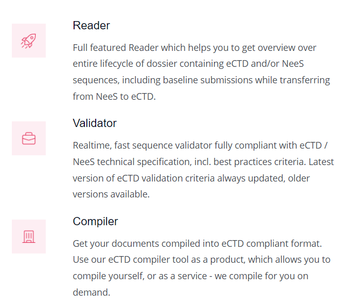 BeeCTD is a full-featured eCTD management solution for pharmaceutical companies and regulatory agencies. Modular architecture and transparent licensing policy allow our users to choose from modules which they want to use – Reader, Compiler, Validator. Full-featured Reader which helps you to get an overview of the entire lifecycle of the dossier containing eCTD and/or NeeS sequences, including baseline submissions while transferring from NeeS to eCTD. Realtime, fast sequence validator fully compliant with eCTD / NeeS technical specification, incl. best practices criteria. The latest version of eCTD validation criteria is always updated, older versions are available. Get your documents compiled into the eCTD-compliant format. Use our eCTD compiler tool as a product, which allows you to compile yourself or as a service - we compile for you on demand.