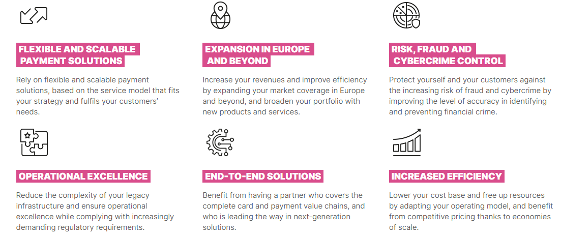 Rely on flexible and scalable payment solutions, based on the service model that fits your strategy and fulfils your customers’ needs. Increase your revenues and improve efficiency by expanding your market coverage in Europe and beyond, and broaden your portfolio with new products and services. Protect yourself and your customers against the increasing risk of fraud and cybercrime by improving the level of accuracy in identifying and preventing financial crime. Reduce the complexity of your legacy infrastructure and ensure operational excellence while complying with increasingly demanding regulatory requirements. Benefit from having a partner who covers the complete card and payment value chains, and who is leading the way in next-generation solutions. Lower your cost base and free up resources by adapting your operating model, and benefit from competitive pricing thanks to economies of scale.