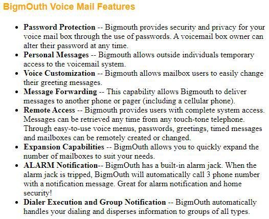 Bigmouth - designed by Talking Technology - is a complete voice mail and phone tree auto dialer package. This award winning software application generator and single-line hardware card is designed for easy creation of voice mail, automatic call transfer (Automated Attendant), interactive voice response and auto dialer applications. The Bigmouth application generator includes resources for message notification, paging and remote access. With Bigmouth - developers, VARs and end-users can easily create message retrieval systems for inside users and outside callers, providing both with the opportunity of sending and retrieving messages. BigmOuth acts as an auto dialer for groups, clubs, churches and schools. BigmOuth can dial a list of up to 300 members and leave a message. The Goldmine Telemarketing Module, an add-on module for Bigmouth, enables BigmOuth to dial groups of unlimited length.
