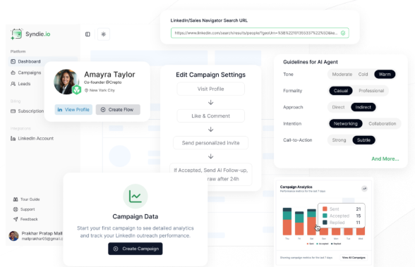 Syndie.io is an AI-powered LinkedIn automation tool designed to enhance personalized outreach. It enables users to create customized campaigns by importing lead lists directly from LinkedIn Sales Navigator or standard LinkedIn search results. Users can design their campaign flow by selecting actions such as profile visits, post likes, connection requests, and timed follow-up messages to create an effective engagement sequence. The platform utilizes AI to generate personalized messages, moving beyond generic templates to foster meaningful connections. Syndie.io also offers features like campaign management, allowing users to run multiple campaigns simultaneously, and provides real-time performance tracking with intuitive analytics and graphs. The tool is designed to mimic human behavior, ensuring interactions remain authentic and within LinkedIn's usage limits. The platform aims to increase engagement, resulting in more replies, meetings, and clients.