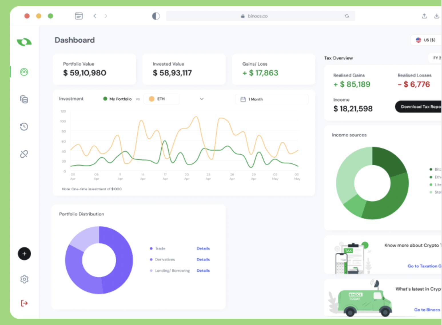 Binocs can sync all your crypto transactions from exchanges and wallets such as Binance, Coinbase and Metamask. We understand all transactions including airdrops, mining, staking, derivatives and even DeFi transactions on protocols like AAVE and Uniswap. Binocs helps you review the portfolio performance across assets and provides a summary capital gains and losses. Our state of the art features like Derivatives & DeFi portfolio gives you an edge. Binocs calculates your taxes and helps you become tax compliant as per local regulations. Our intelligent cost basis engine provides reliable data for calculating your crypto gains. Download a detailed tax report in a click. No personal information is required to set up your account and profile. Binocs has no KYC requirements, which means you can continue using our features and softwares anonymously. To sign up, only your email ID is required. But apart from that, KYC-related documents are not needed.