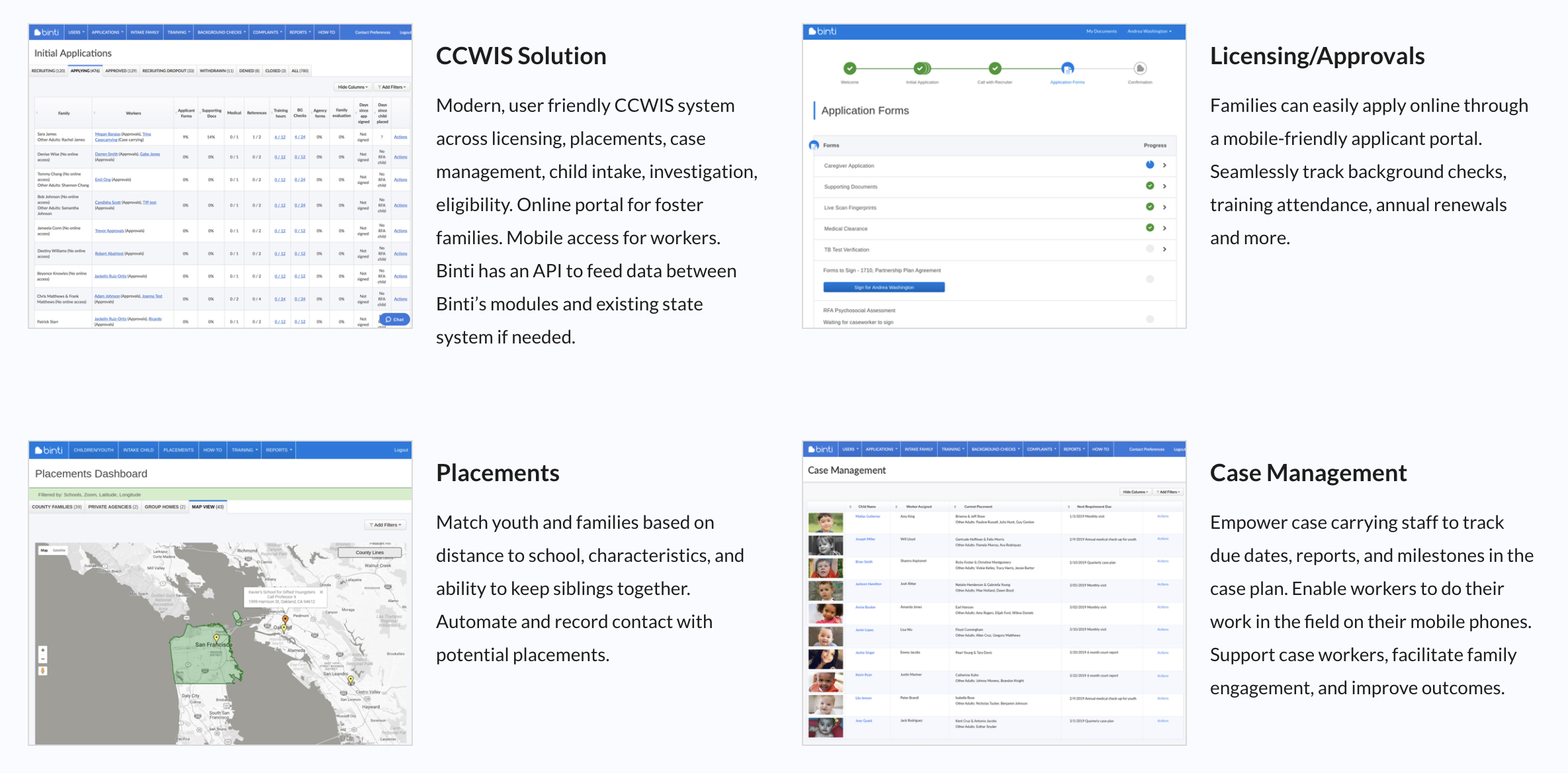 Reinvent child welfare with us. Modern, mobile-friendly software driving measurable results and promoting quality practice. Binti’s modules, used individually or as an entire CCWIS solution, are designed to empower teams and communities to support youth and families. Designed to securely integrate with other systems, the modules allow for collaboration across service areas such as Medicaid, including acting as part of an MMIS system. Modern, user friendly CCWIS system across licensing, placements, case management, child intake, investigation, eligibility. Online portal for foster families. Mobile access for workers. Binti has an API to feed data between Binti’s modules and existing state system if needed. Empower case carrying staff to track due dates, reports, and milestones in the case plan. Enable workers to do their work in the field on their mobile phones. Support case workers, facilitate family engagement, and improve outcomes.
