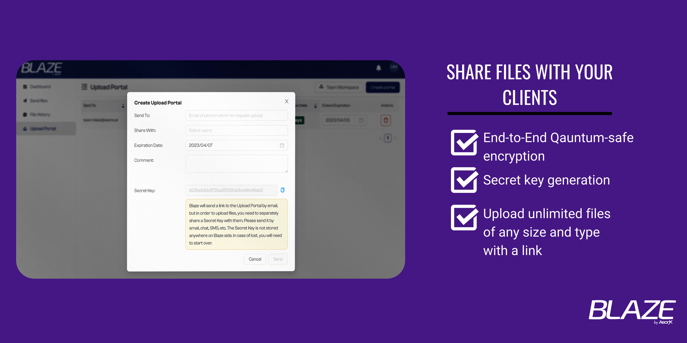 The platform also supports interaction with external, non-BLAZE users, offering a secure upload and download portal operated by a unique shared security key for file exchange.