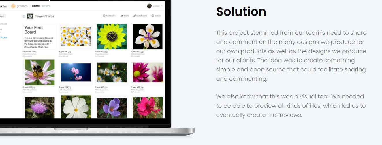 Boards is a visual collaboration tool which allows you to manage, organize and share thousands of files and notes with your teammates. Whether you need to show your client the latest website design or collect design ideas for a wedding, Boards is a great place to keep it all. This project stemmed from our team's need to share and comment on the many designs we produce for our own products as well as the designs we produce for our clients. The idea was to create something simple and open source that could facilitate sharing and commenting. We also knew that this was a visual tool. We needed to be able to preview all kinds of files, which led us to eventually create FilePreviews. Boards was one of our first products released in the "single page app" style. We built a very attractive interface that it's fast and really easy to understand while at the same time providing a lot of functionality.