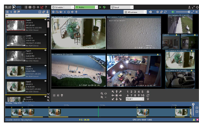 Keep an eye on your family, home, business, cars & valuables. Remotely view your live cameras & recorded videos. Robust alerts on cameras and other conditions. V5 features a new user interface with every element redesigned! Use up to 64 cameras (webcams, network IP cams, analog cards, or your Windows PC desktop). Capture JPEG snapshots or movies in standard MP4, AVI, advanced DVR, or Windows Media file formats. Use motion or audio sensing to trigger recording, or record continuously or periodically. Overlay the current date/time as well as a logo or other information. Optionally record audio. Use a timer to determine when the system is armed. Images may be captured as either JPEG images, MPEG movies or Windows Media movies. Receive alerts via loudspeaker, email, instant message, voice phone call (with automatic redial), or external program/script. Run Blue Iris as a Windows service so that only you have control over its operation on a shared PC.