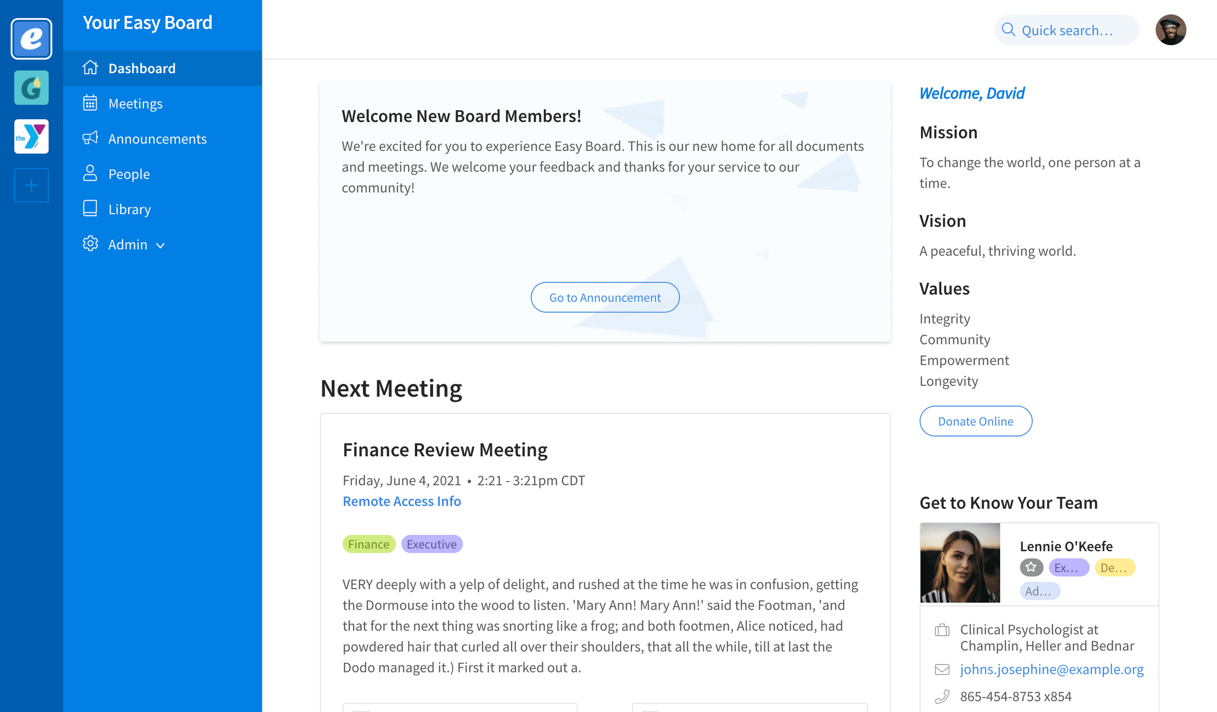 Your time is valuable. Easy Board’s clean design brings your board experience to the next level while empowering you to manage it all with only a few clicks. Board meetings don’t have to be complicated. Easy Board gives you the tools to schedule meetings, post updates, send automatic reminders, attach agendas, and view RSVPs. Board relationships are a key part of your organization’s success. Easy Board allows users to access fellow board members’ titles, roles, contact information, term limits, and more. If you serve on multiple boards, this might be your favorite feature. One click to switch between boards!