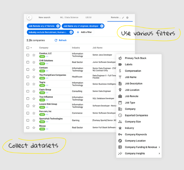 Every user has a protocol for quality, delivery, and guarantees. Our mission is to source real-time job signals that will make you grow. Elevate job posting signals by targeting only relevant data (gold) and removing everything else (rocks). Exclude the chance that you'll miss an opportunity signal or your team will be idle without proper data to work with. Use any combination of 25+ filter parameters to find signals that you won’t find anywhere but rocks.gold. Our customer success protocol will ensure that users will maximize data delivery on search parameters. Enable custom alerts and tracking to be notified about the most important companies' signals or updates. Receive filtered job signals within minutes after a job was posted, or enable timely exports in batches.