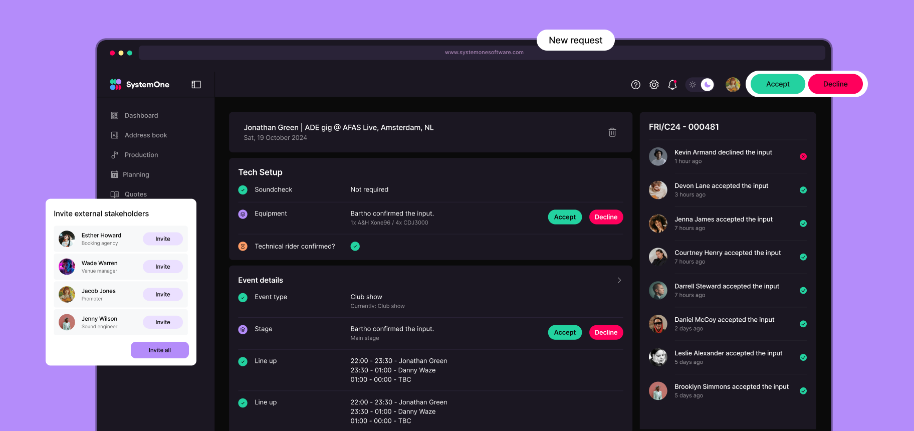 SystemOne is a cloud-based platform for booking agencies to streamline your entire process—from request to show. The browser platform & mobile app offer a comprehensive feature set, including contact management, artist booking & scheduling, and tour management & logistics. It provides customizable document templates, automatic eSign, and integrated itinerary management.
