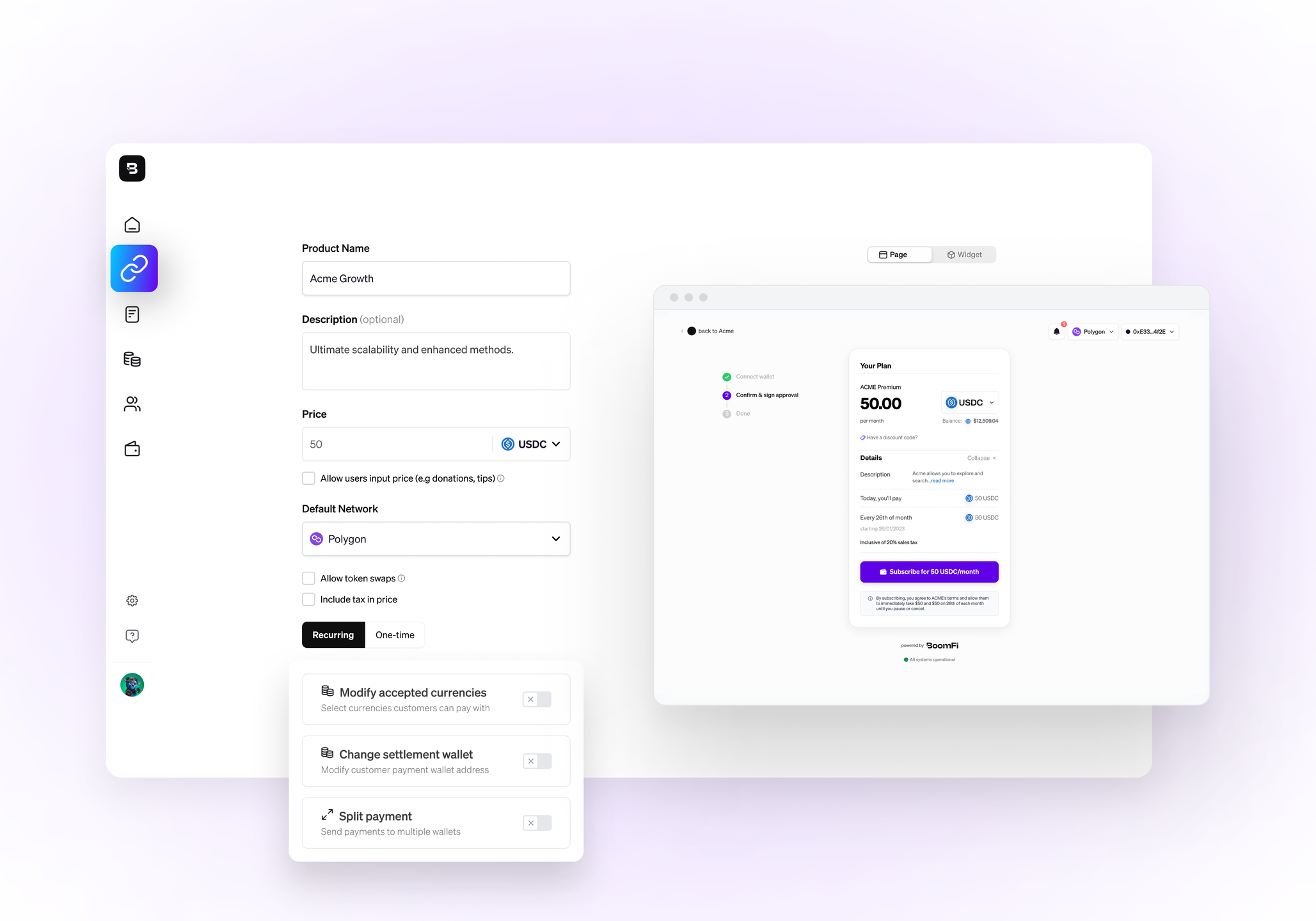 With BoomFi, you can easily collect one-time or recurring payments and settle in either crypto or fiat currencies. We offer a range of integration options including no-code, low-code, API, and embedded solutions. Our transaction fees are a flat rate of 1% plus 25 cents per transaction.