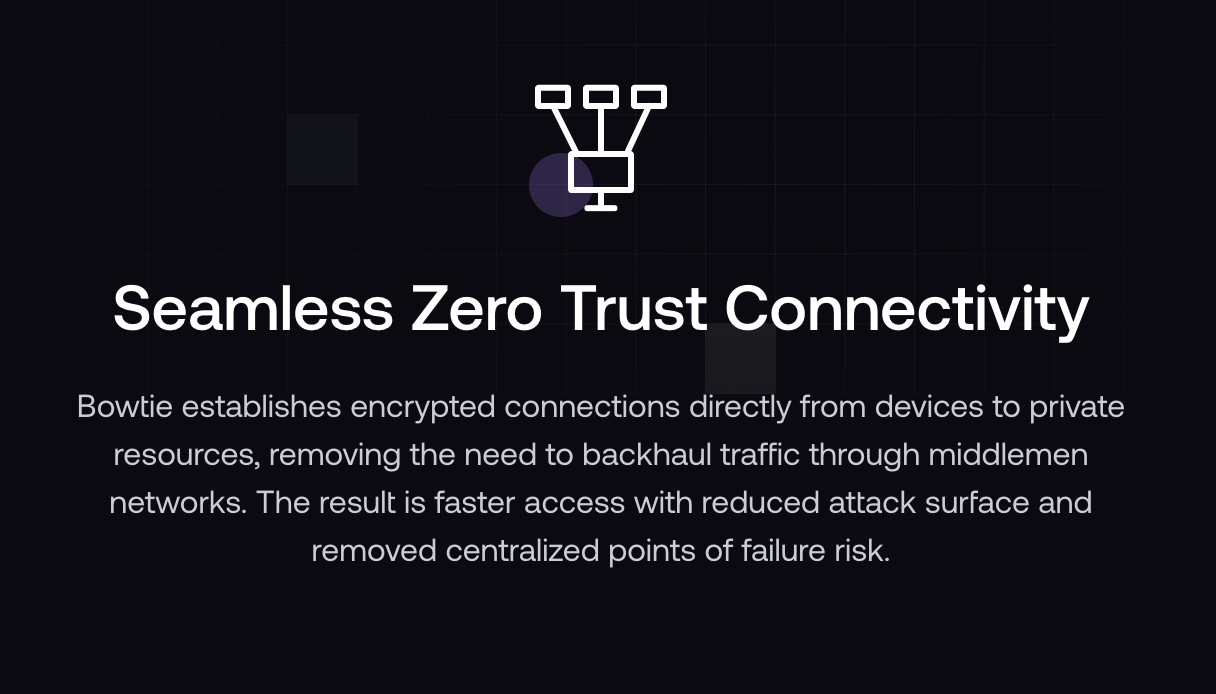 Bowtie is a next-generation security platform that delivers a faster, smarter, and more resilient solution to enterprise network security. Our distributed overlay approach keeps your users more secure without slowing them down. Bowtie establishes encrypted connections directly from devices to private resources, removing the need to backhaul traffic through middlemen networks. The result is faster access with reduced attack surface and removed centralized points of failure risk. No more routing internet traffic through processing sites in the cloud. With Bowtie’s SWG in place, users still have direct access to the internet ensuring zero impact to the browsing experience. With enforcement occurring on device, we minimize the pitfalls of cloud processing sites. Bowtie’s user-invisible agents deliver authentication, encryption, and access enforcement without compromising user experience. One agent and administrative console deliver all functionality.