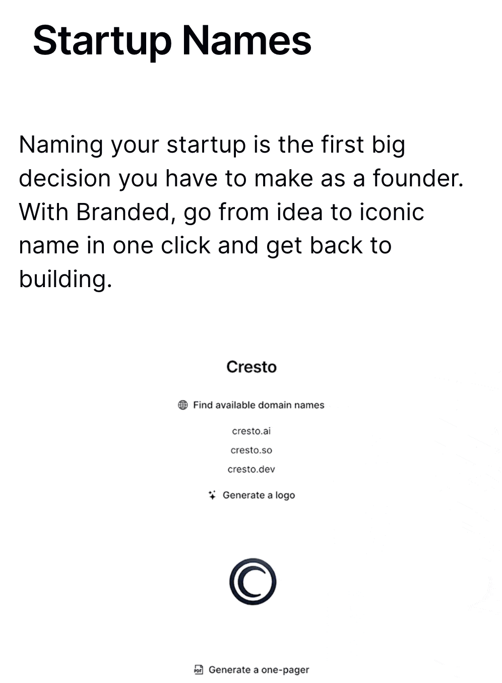 Branded helps founders name their startup, secure the domain, and brand it—all in one place. Naming your startup is the first big decision you have to make as a founder. With Branded, go from idea to iconic name in one click and get back to building. Secure the perfect domain name for your startup in seconds with our AI-assisted domain availability lookup—purpose-built to help you secure a memorable domain. Use Branded to generate custom branded content—including logos and one-pagers—for your startup without the headaches.