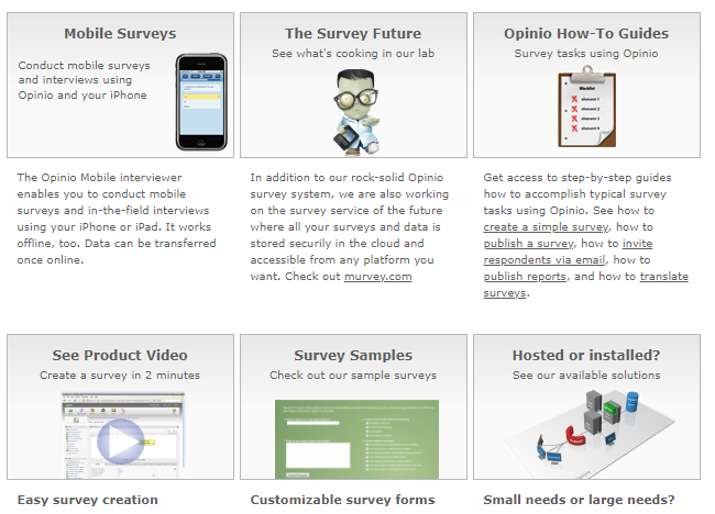 Design, publish and manage all your surveys using one of the market's most powerful survey software. Construct and publish your surveys in minutes. 100% web-based, you only need your web browser. Increase response rates using automatic email reminders. Installed and hosted solutions available. Opinio supports multiple users, multilingual surveys, survey collaboration, powerful features such as skip logic and piping, and a highly scalable architecture so it will cover the survey needs for everyone in your organization. The Opinio Mobile interviewer enables you to conduct mobile surveys and in-the-field interviews using your iPhone or iPad. It works offline, too. Data can be transferred once online. In addition to our rock-solid Opinio survey system, we are also working on the survey service of the future where all your surveys and data is stored securely in the cloud and accessible from any platform you want.