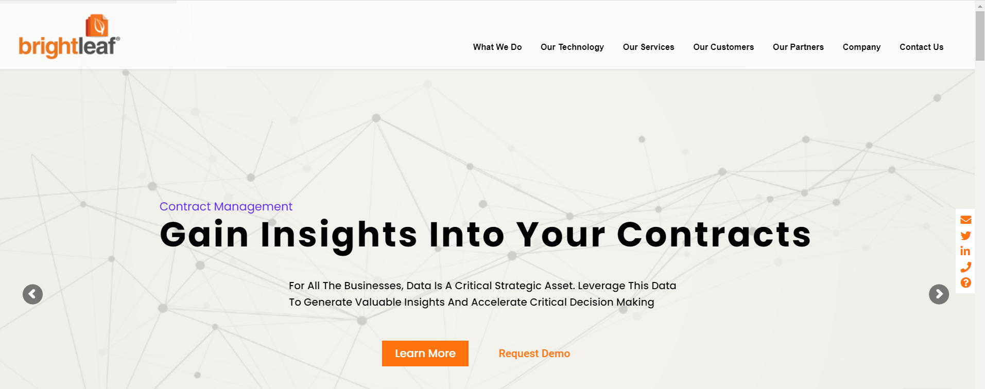 Brightleaf provides a technology-powered service to extract information from your contracts using our own proprietary semantic intelligence/natural language processing technology, our own team of lawyers to check the output, and our own Six-Sigma process to deliver highly accurate extracted data from your contracts. Your legacy contractual documents along with this extracted meta-data can be migrated into a Contract Lifecycle Management (CLM) system for tracking and reporting. This greatly enhances the value of your investment in the system. The data can be virtually anything, and it is customized for each of your types of contracts. All meta-data, terms and conditions, legal provisions, and even all obligations (which are usually scattered throughout your contracts) are extracted by our software.