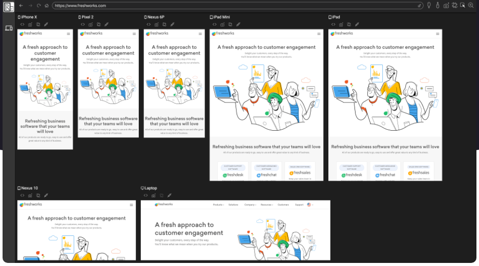 A must-have development tool for all front-end developers that will make your job easier. Preview all target screens in a single window side-by-side. Brings down your development time! Use your already familiar dev tools from the browser. No additional learning curve! Lets improve it together! Your contributions are welcome here. Any click, scroll, or navigation that you perform on one device will be replicated to all devices in real-time. Customize the arrangement of the devices to suit your every need. Inspect any element in any device with just one click, no hassle! Has 30+ built-in device profiles covering all major devices. You can even add new custom device profiles as you like. Get instant feedback on the pages that you develop with the powerful screenshots tool. Take a full-page screenshot of all devices or a specific device with just a single click! Install the handy browser extension to easily send links from your browser to the app and preview instantly.