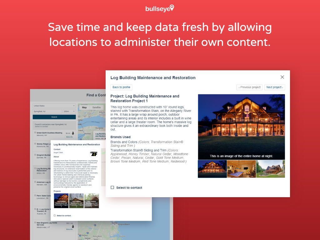 With SEO-friendly landing pages, automated real-time lead management, and more, Bullseye is the locator that partners love. Easily integrate partner pages on your website to showcase their work with your products, build trust with customers, and turn your ordinary locator into a lead generating machine.