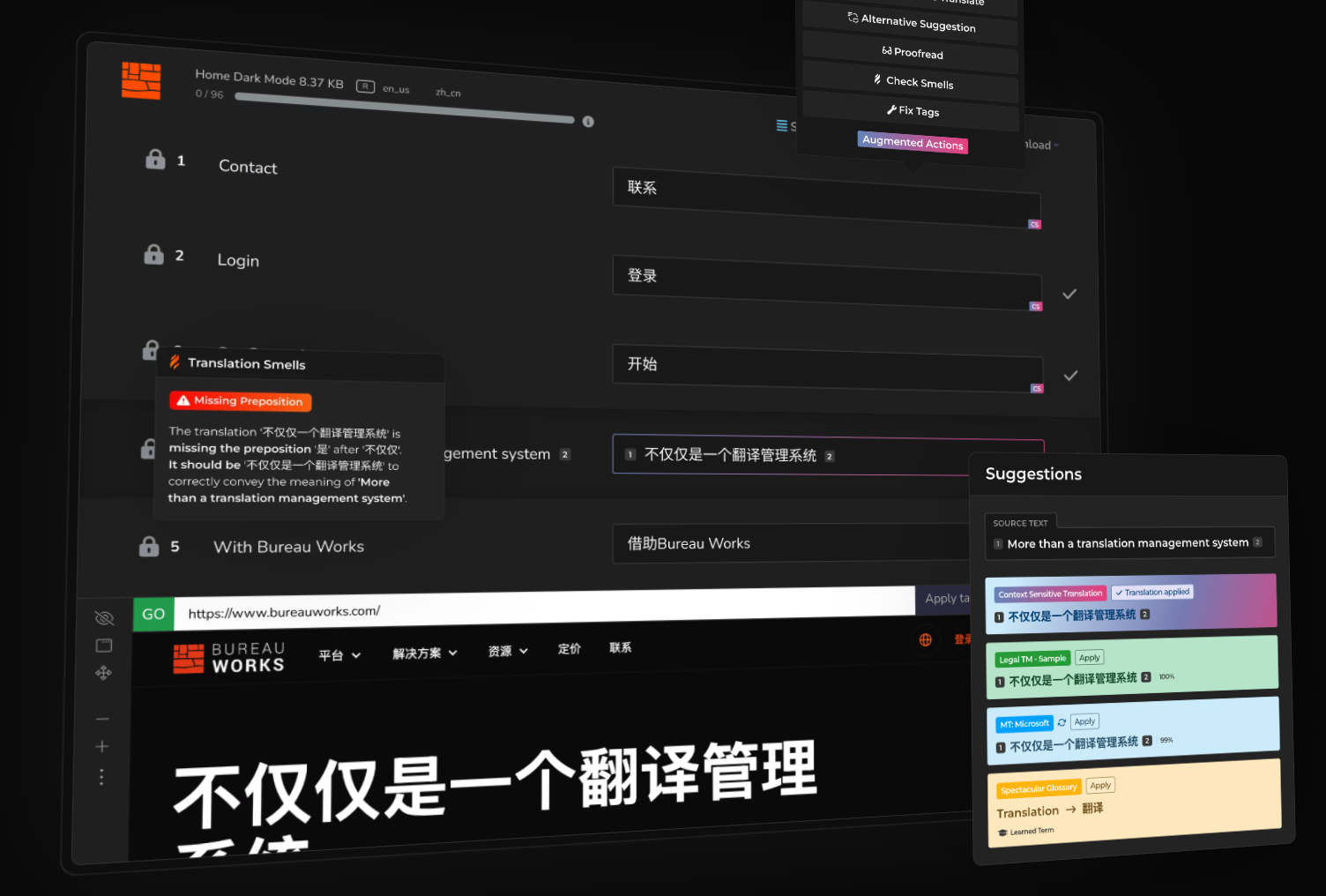 With Bureau Works' context-first translation platform, localization managers, translation agencies, translators, and devs alike can translate, contextualize, and scale global experiences that get results - all backed by enterprise-grade hosting and security.