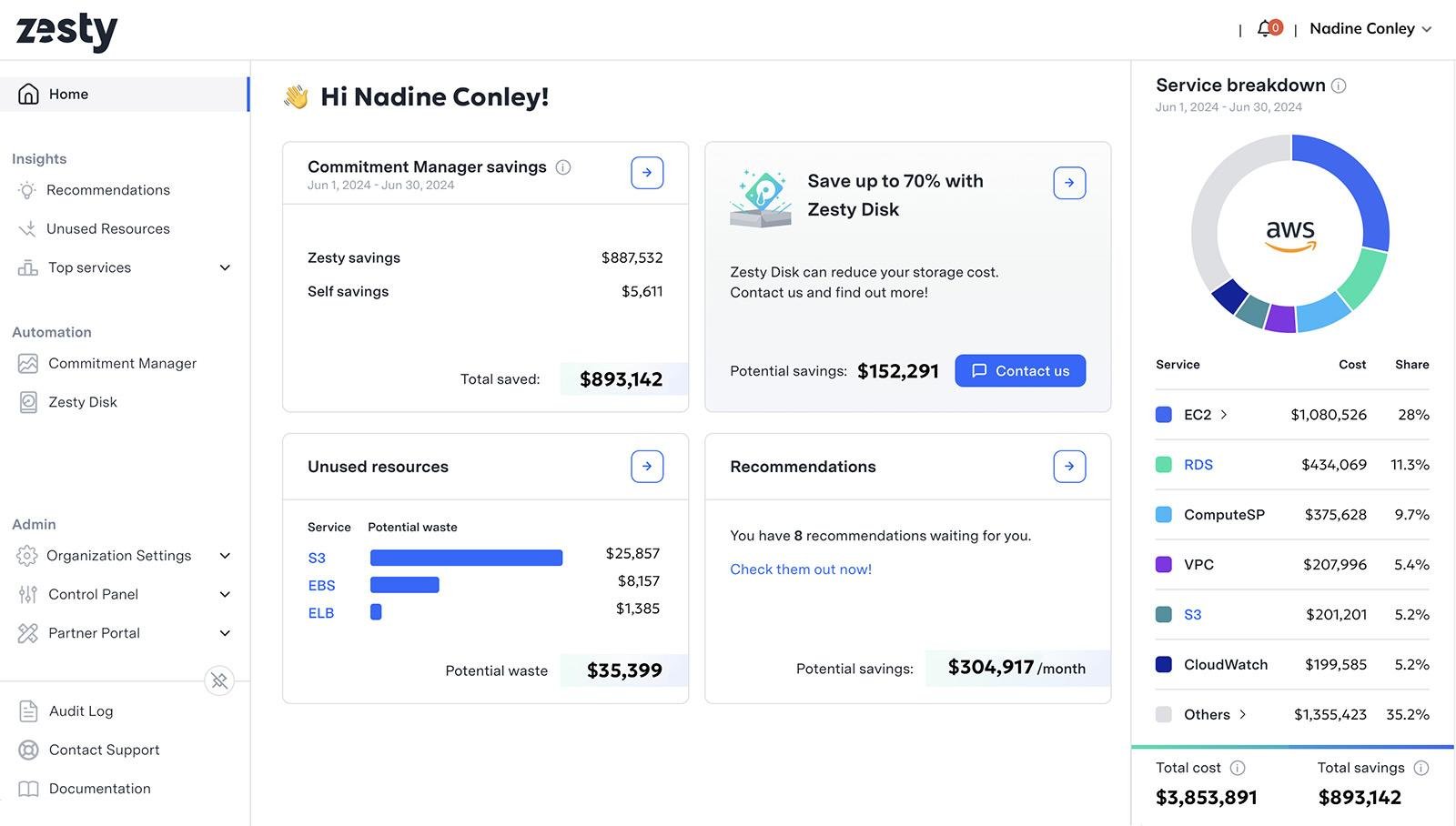 Zesty Insights provides a clear overview of potential savings and unused resources, and actionable recommendations that help you focus on the most efficient savings opportunities.