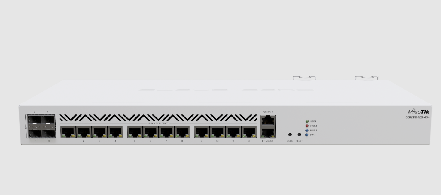 We wanted to see the full potential of the good, old, reliable 10G networking combined with a modern CPU. CCR2116-12G-4S+ allows you to forget about CPU limitations in your setup. Like its younger brother – the amazing CCR2004, this router features the mighty Amazon Annapurna Labs Alpine CPU. But with 16 cores running at 2 GHz, this CCR eats the other one for breakfast. For example, we see at least a 15% increase in single-core performance. And that is the most important aspect when it comes to heavy operations based on per-connection processing. Like queues, for example. CCR2116-12G-4S+ sets a new standard of single-core performance in the whole CCR product family! And it supports Layer 3 Hardware Offloading! Obviously, you need the right connectivity to harness this power. There are four 10G SFP+ ports. They have a separate, full-duplex line connected to the Marvell Aldrin family switch chip. Then we have Gigabit Ethernet ports. 12 of them are running through the Marvel chip.