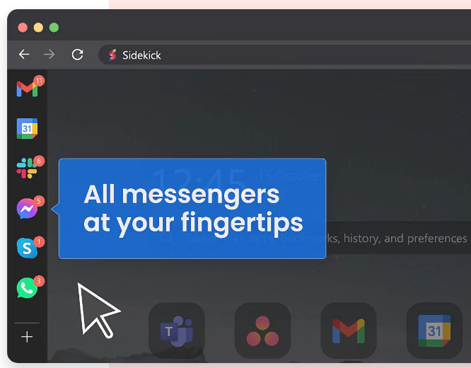 Today, anyone who works in a browser fights to stay organized. Tabs are out of control, browser windows are all over the place, and desktop apps may work on their own, but they don’t integrate well with the rest of your work on the web. Sidekick doesn’t have an ad-based business model, so we can block ads and trackers without compromise. Sidekick saves memory by automatically suspending tabs that you don't need at the moment. Sidekick uses significantly less memory when you work with similar tabs. You spend 90% of your time working in web applications. So we reimagined the browser UX around apps, a better way to work in the most productive applications on the web. Never lose your work in a sea of shifting tabs again. Turn your web applications into apps and put them in the sidebar to stay. Access anything with one click. Now you can be in every account on every platform simultaneously. Even if it's not natively supported.