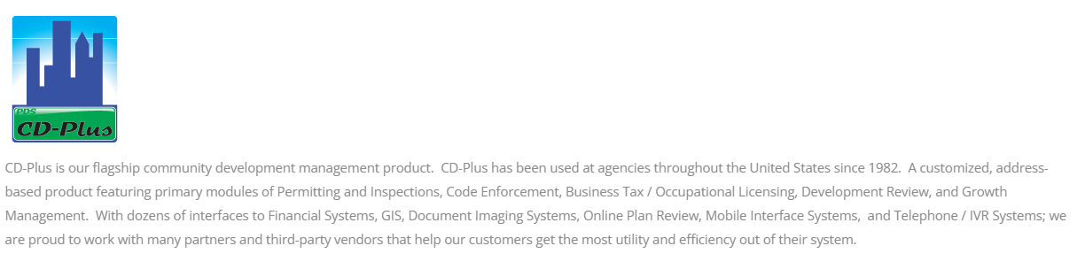 CD-Plus is our flagship community development management product. CD-Plus has been used at agencies throughout the United States since 1982. A customized, address-based product featuring primary modules of permitting and inspections, code enforcement, business tax/occupational licensing, development review, and growth management. With dozens of interfaces to financial systems, GIS, document imaging systems, online plan review, mobile interface systems, and telephone/IVR systems; we are proud to work with many partners and third-party vendors that help our customers get the most utility and efficiency out of their system. Perconti Data Systems, Inc. markets software in several different markets and sectors all over the country. Our primary products are listed below with a brief synopsis of each product, more detailed information about each product can be found by clicking on the link for that product.