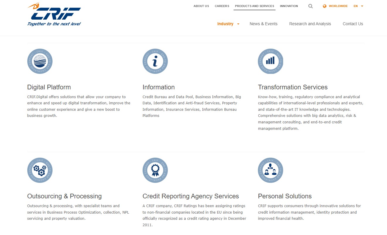 Digital Platform, Information, Transformation Services, Outsourcing & Processing, Credit Reporting Agency Services, and Personal Solutions. CRIF.Digital offers solutions that allow your company to enhance and speed up digital transformation, improve the online customer experience and give a new boost to business growth. Credit Bureau and Data Pool, Business Information, Big Data, Identification and Anti-fraud Services, Property Information, Insurance Services, Information Bureau Platforms. Know-how, training, regulatory compliance and analytical capabilities of international-level professionals and experts, and state-of-the-art IT knowledge and technologies. Comprehensive solutions with big data analytics, risk & management consulting, and end-to-end credit management platform.