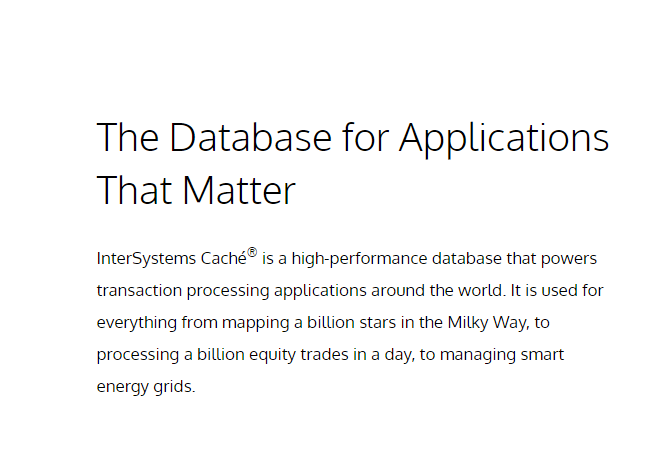 InterSystems Caché® is a high-performance database that powers transaction processing applications around the world. It is used for everything from mapping a billion stars in the Milky Way, to processing a billion equity trades in a day, to managing smart energy grids. Caché is a multi-model (object, relational, key-value) DBMS and application server developed by InterSystems. InterSystems Caché provides several APIs to operate with same data simultaneously: key-value, relational, object, document, multi-dimensional. Data can be managed via SQL, Java, node.js, .NET, C++, Python. Caché also provides an application server which hosts web apps (CSP), REST, SOAP, web sockets and other types of TCP access for Caché data.