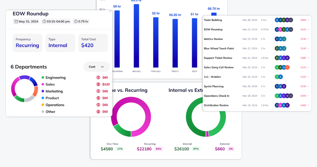 Use Calendyze to slash meeting costs, free up time, and prioritize work that boosts your bottom line. In a world where managers report that more than half of all meeting time is a waste, Calendyze is the tool that helps you reclaim that time, boost productivity, and fuel healthy meeting efficiency. Use your metrics to set goals for your team to keep them on track with their meeting habits. Discovering the true cost of your meetings has never been easier. Calendyze helps you identify hidden expenses and reveals opportunities for big savings, all while freeing up more time for work that actually drives revenue. Single sign-on with your Google credentials and invite your team to join you in seconds. Calendyze integrates with your Google Calendar and uses your team’s compensation data entered by your Admin to estimate the financial impact of each meeting. You can further compare costs between internal and external, one-time and recurring meetings.