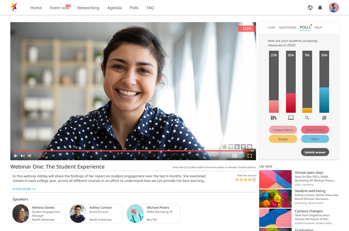 Canapii supports video meetings and streams HD quality keynotes across PC browsers and mobile apps. It drives audience engagement through chats, comments, notifications, gamification, live questions, and polls. Automation is core to Canapii. Registration, travel arrangements, personal agendas, and meeting approval systems are all built in the platform.