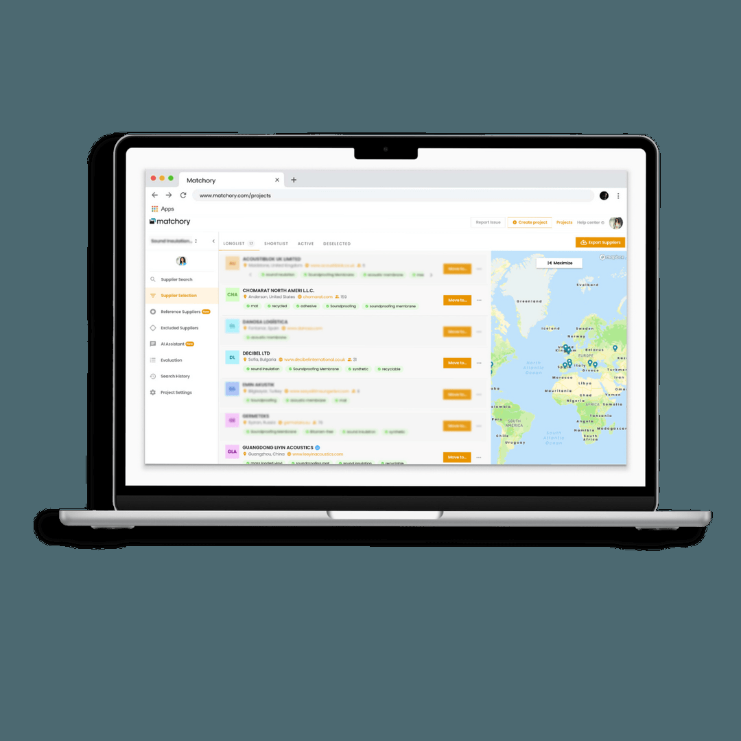 Project-based searches don't enable companies to efficiently expand supplier discovery on a larger, strategic scale. Traditional search engines require precise search terms, and results are often influenced by paid ads and SEO rankings, meaning searches might need to be repeated across multiple countries to achieve a well-rounded selection. Meanwhile, other generative AI tools provide broad knowledge rather than specialized expertise for targeted category scouting. Find relevant suppliers worldwide at the touch of a button using the latest technology and intelligent live search. In-depth market information and transparent supply chains help you make the right decisions. Standardized workflows simplify your processes and provide secure and complete documentation. Users of Matchory can perform continuous analysis of the supply market to monitor new entrants and compare sub-sectors.