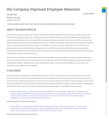 Generate professional case studies at lightning speed using a proven storytelling framework and ChatGPT technology. Complete a short 5-minute virtual interview on behalf of your customer. Anyone in your organization that is close to the customer can complete the interview. Customer success or support team members are ideally placed to answer the questions. Case Study Writer will use ChatGPT technology to create a case study and customer story. Validate, edit, and improve the output is more accessible than starting from scratch every time.