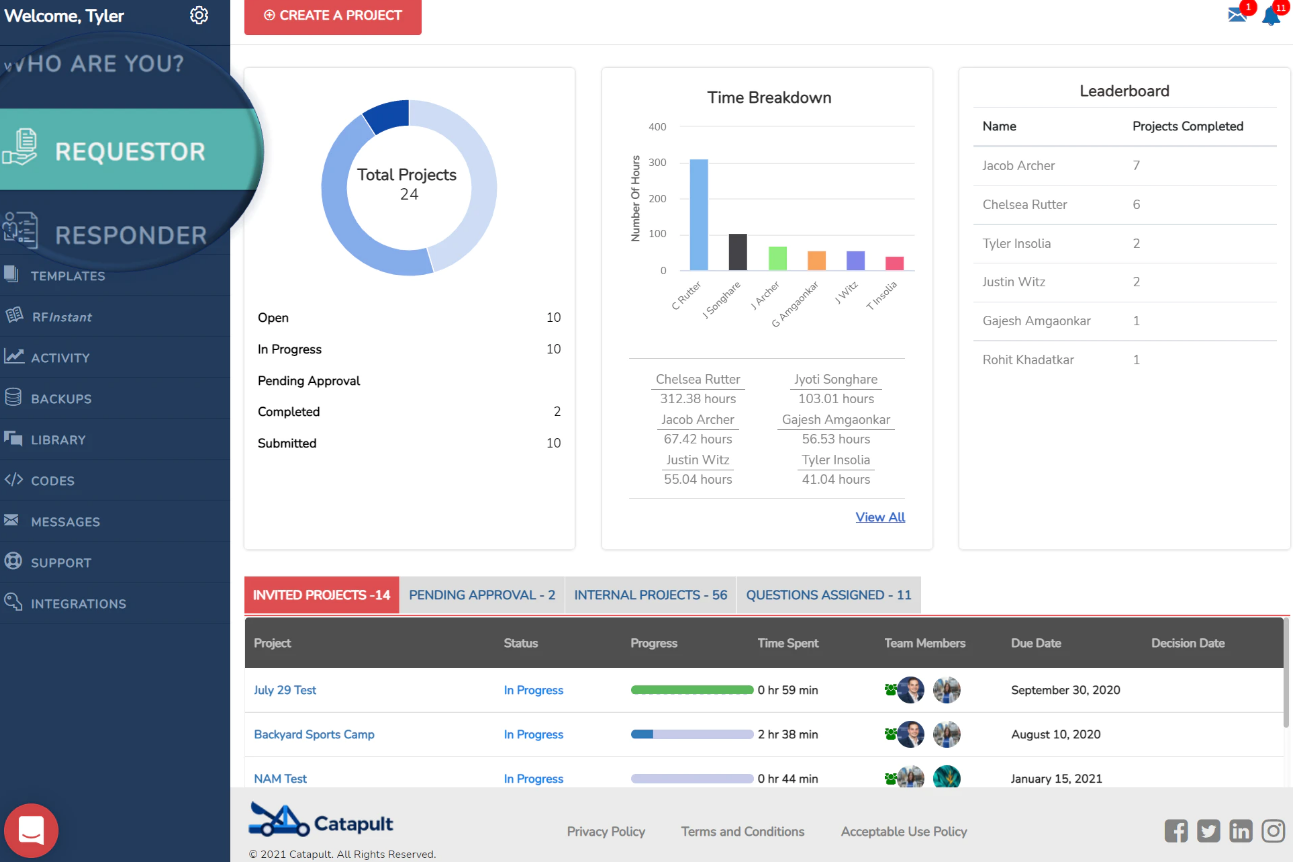 Catapult™ is an all-in-one Request for Proposal solution that streamlines procurement departments through repeatable workflows and automation. With Catapult you can create and respond to new opportunities, evaluate and score responses, and, deliberate over contract terms. In addition, you can collaborate with team members over question structure or responses as you build and manage your content library to expedite RFP responses. With Catapult’s workflow automation clients have reduced the time it takes to respond by over 90% while increasing output by 66% with the same headcount. You too can experience these same results while increasing your confidence in the effectiveness of your questions or the quality of your responses for any RFP engagements in a quick and efficient manner that is unique to Catapult subscribers.