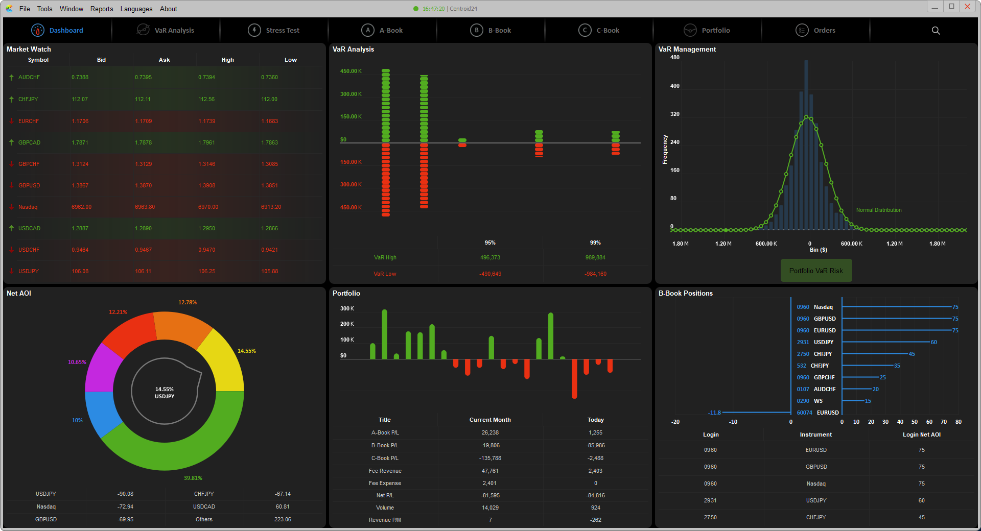 Centroid24 is a fully-featured, all-in-one, risk-management solution tailored for modern brokers. It will help you measure the level of market risks under any market condition, improve the company’s risk-adjusted performance by leveraging huge amounts of data in real-time, and assess the firm’s potential losses under different market conditions. Centroid24 serves as a fundamental complement to the Meta Trader and other renowned trading platforms in the Forex industry. Real-time Value at Risk at the portfolio level and per asset class. Current month and current day P/L breakdown (A, B, & C books P/L, rebates, Commissions, volume, and revenue/million). Large aggregated orders per client. Performance reports (Revenue Report, Instrument Profitability Report, Company Trading Statistics Report, Risk Report). All reports are excel produced and can be auto generated and send to a list of emails on daily and monthly basis.